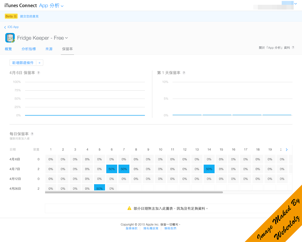 「保留率」頁籤可以看到使用者下載 App 之後,過了多久還仍再使用此 App 。 App Analytics - Page 4