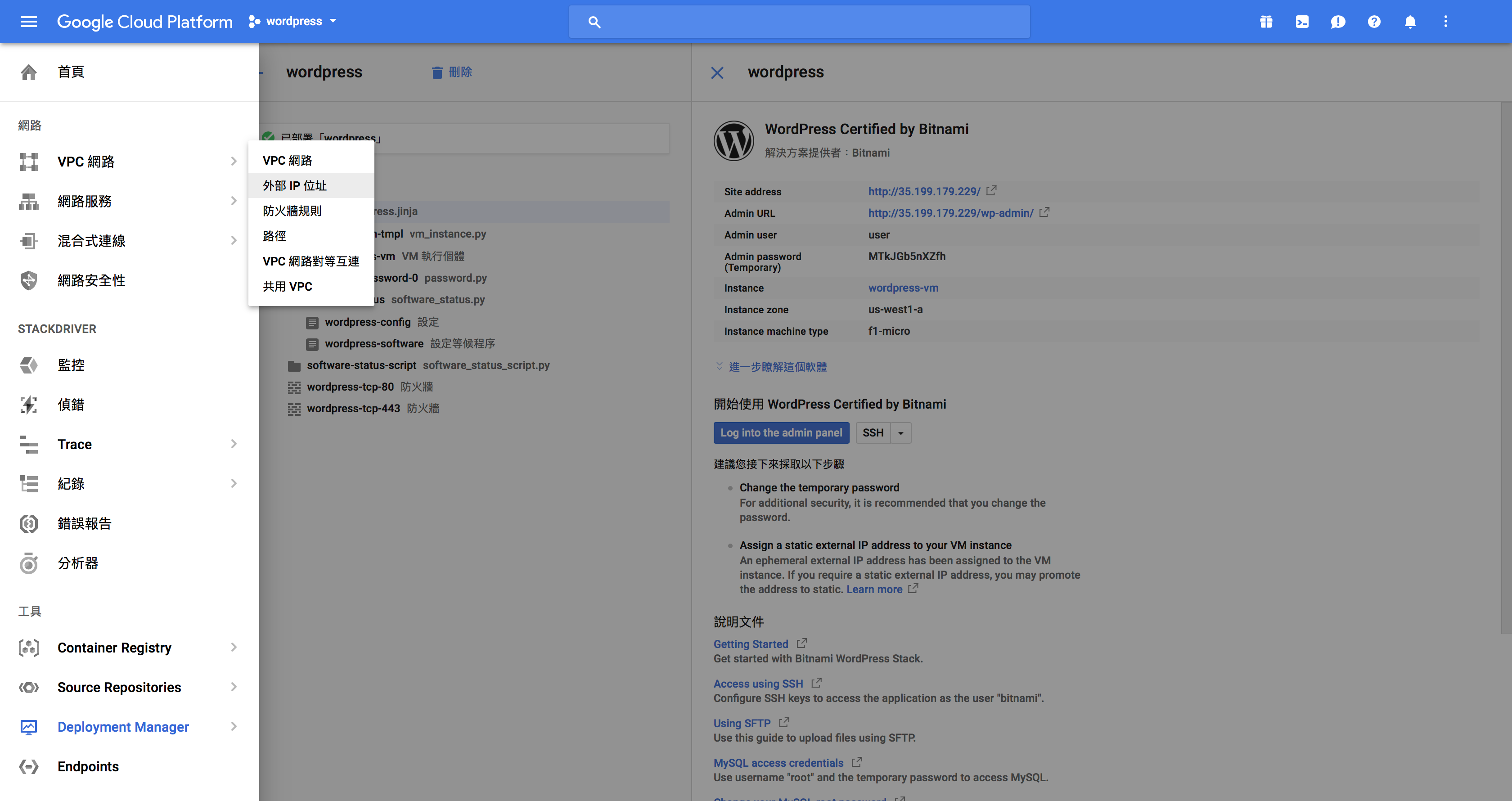 右手邊有這台主機的 IP、WordPress 使用者名稱跟密碼等資訊。