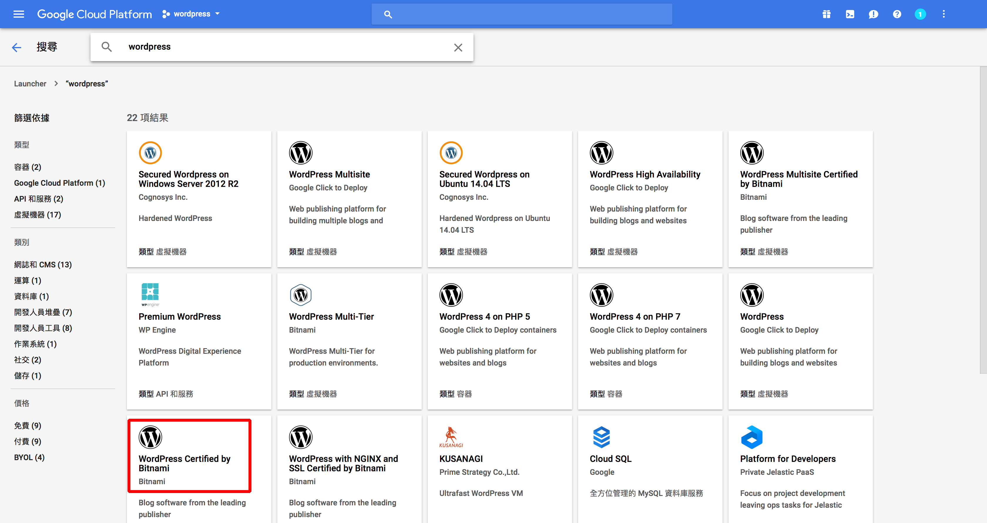 之後會列出許多不同 WordPress 的解決方案,在這邊以「WordPress Certified by Bitnami」來示範