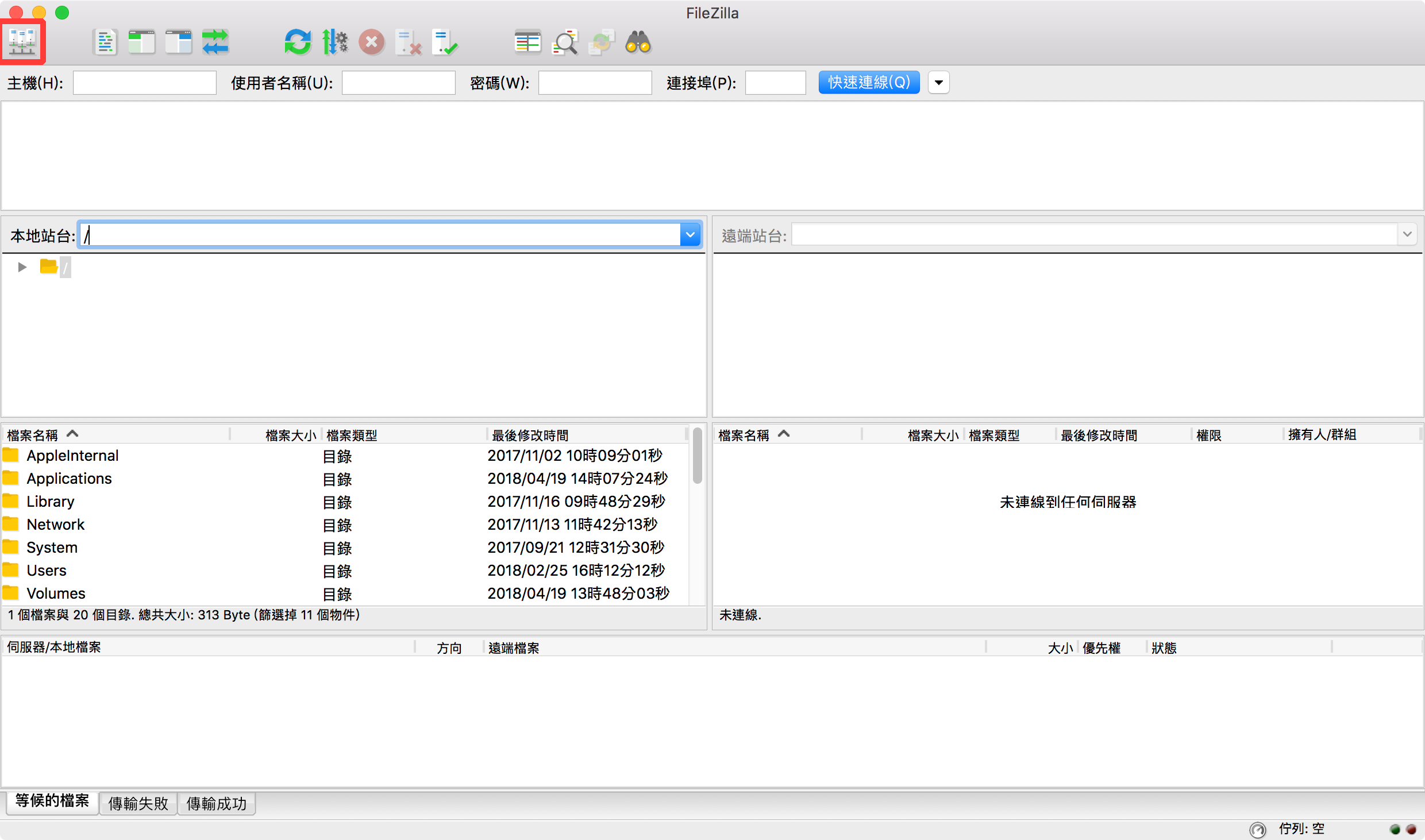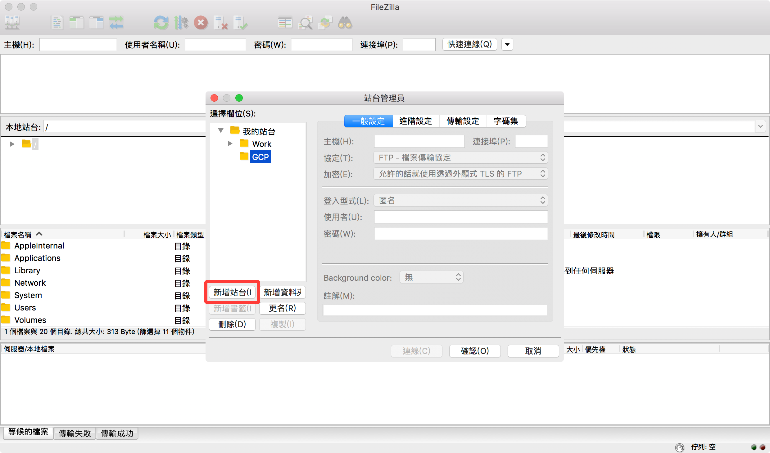 啟動 FileZilla 後,按下左上角的「站台管理員」