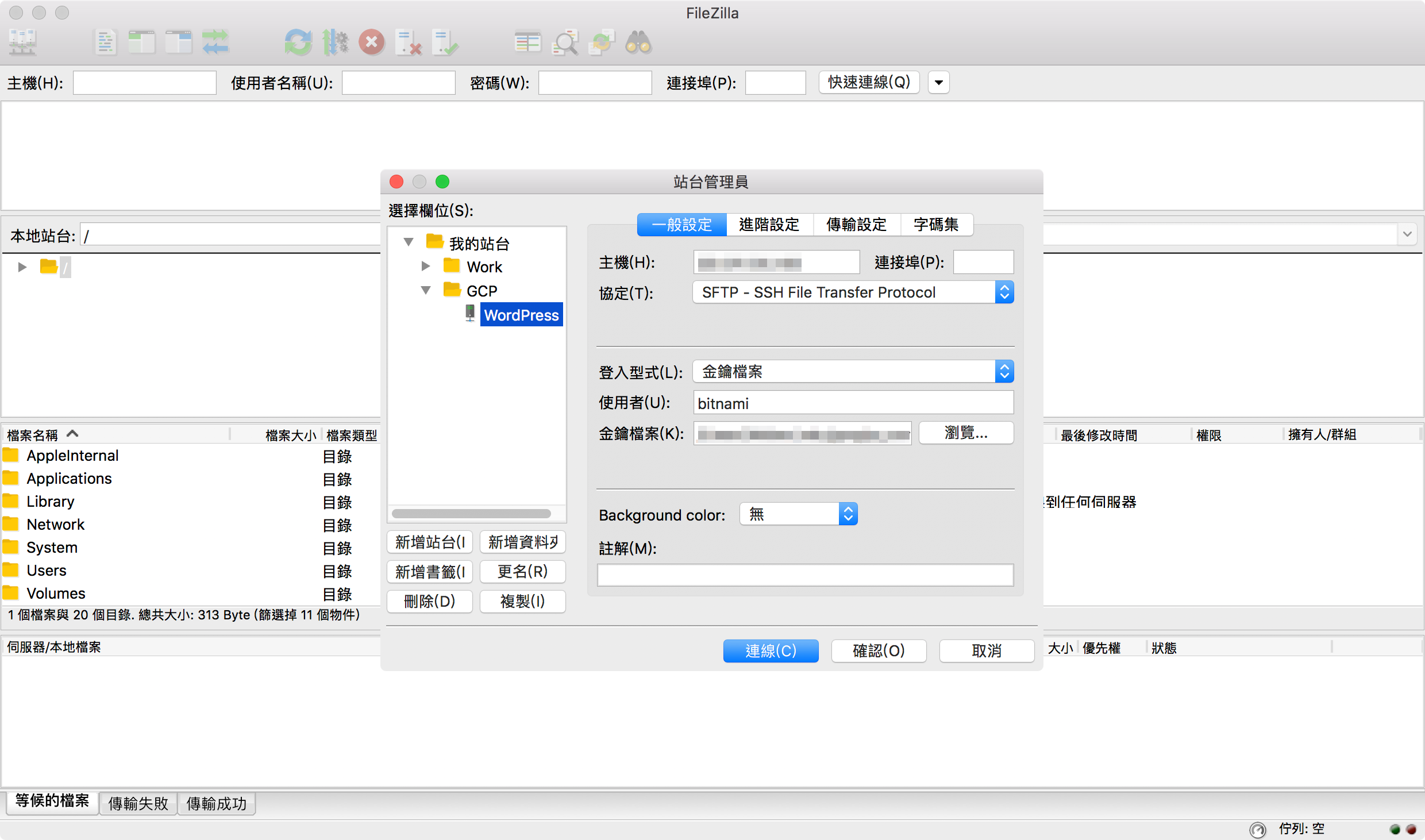 接下來就要輸入 WordPress 主機的連線資訊囉!,多數資料與透過 SSH 與 WordPress 主機連線的相同,就照著輸入吧~