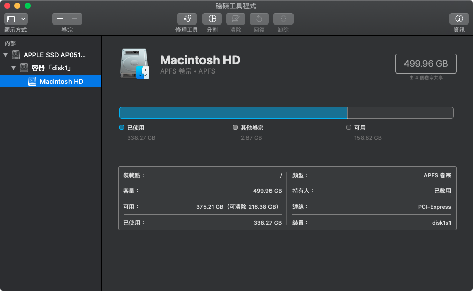 首先,先確定系統硬碟空間是否還足夠(建議剩餘空間還有 20G 以上)且格式為 APFS>
