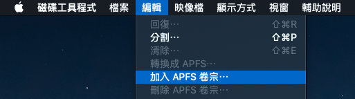 選取你要分出空間的磁碟區後,按下上方選單的「編輯」->「加入 APFS 卷宗」