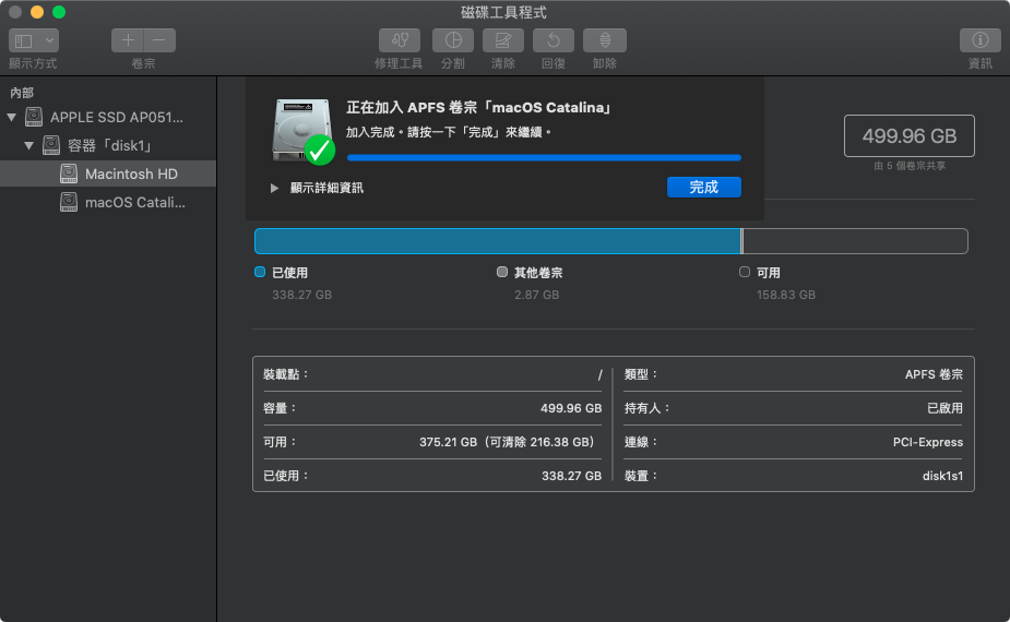 為這個磁碟命名吧!這邊我就叫他 macOS Catalina,完成後按下「加入」
